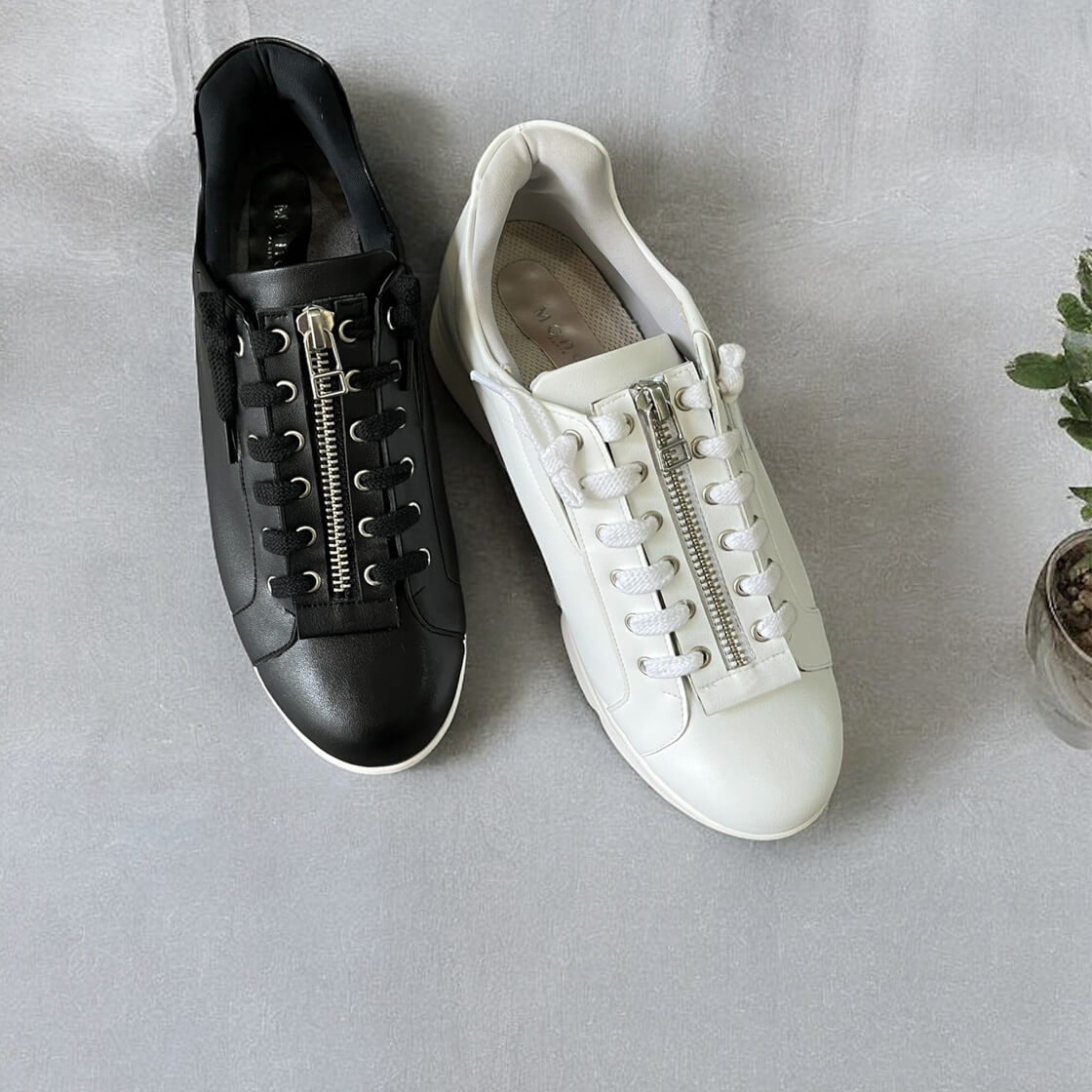 大きく開くファスナーで靴ひもを結んだままでも脱ぎ履きがらくらく。