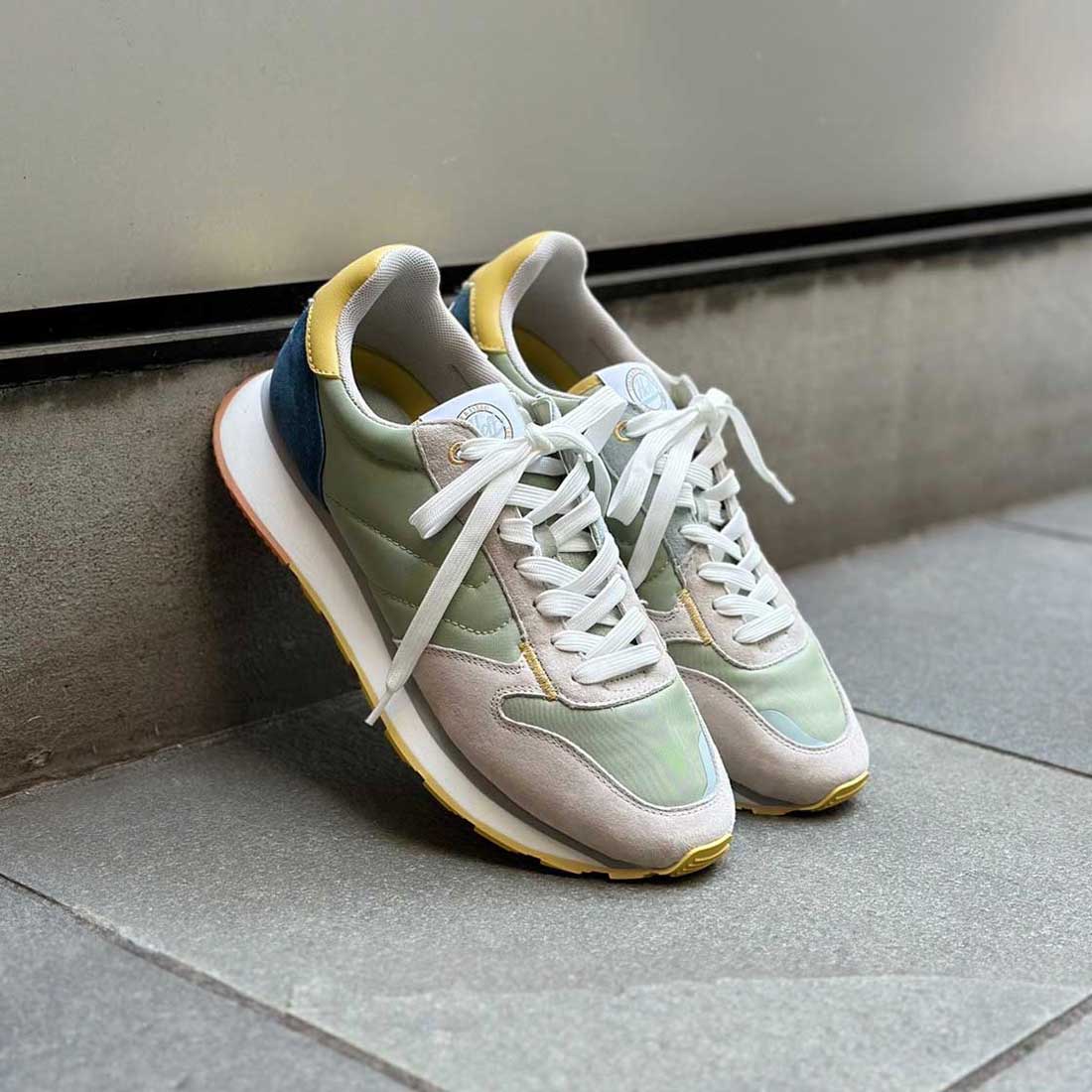 複数のマテリアルがコンビされたローカットスニーカー。
