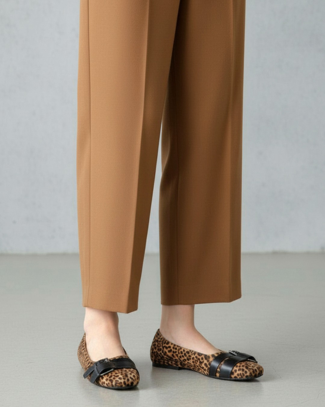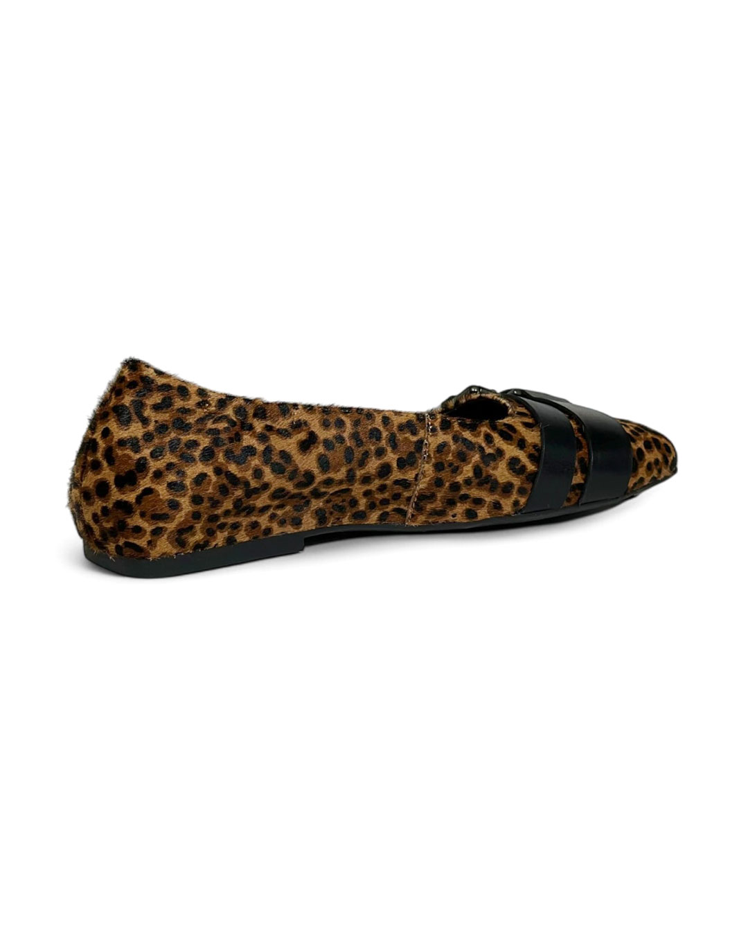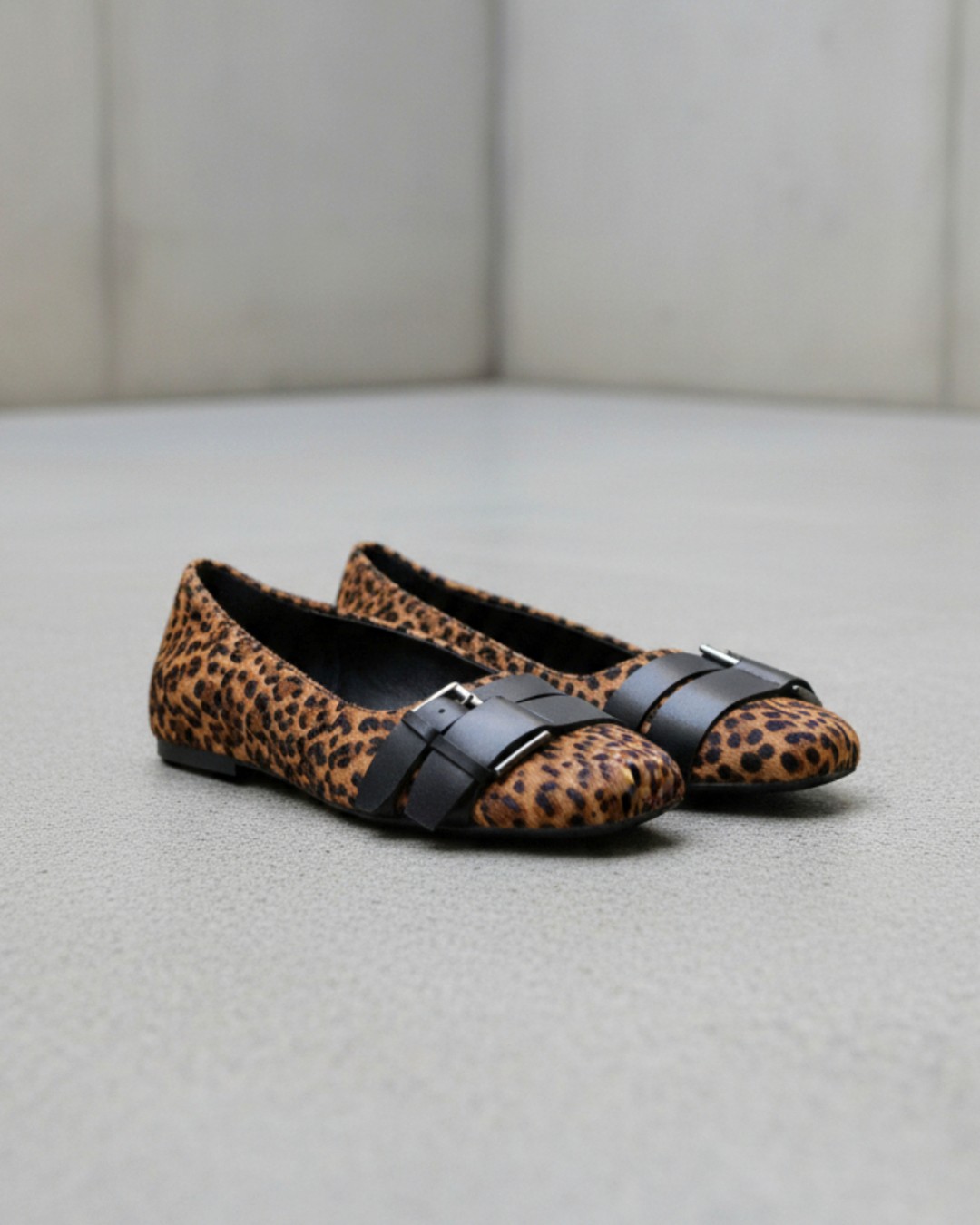 シンプルなフォルムのフラットパンプスをハラコ風のレオパード柄アッパーに仕上げ、主役級アイテムへとアップデートした一足。