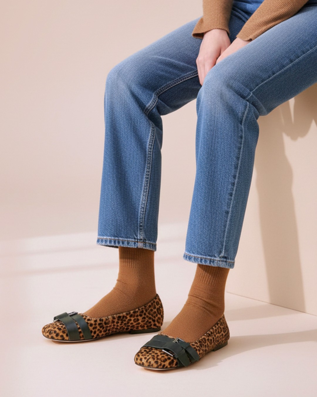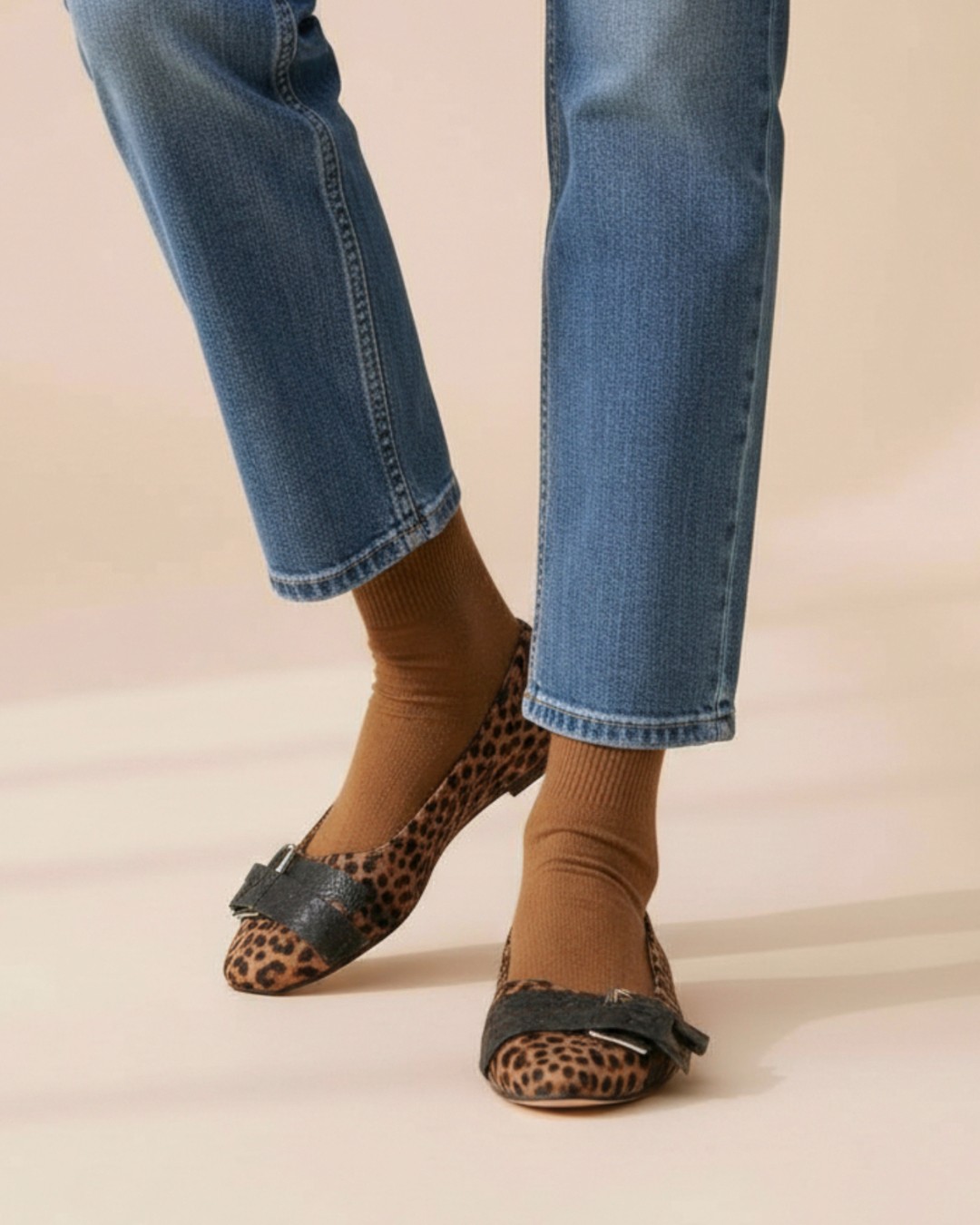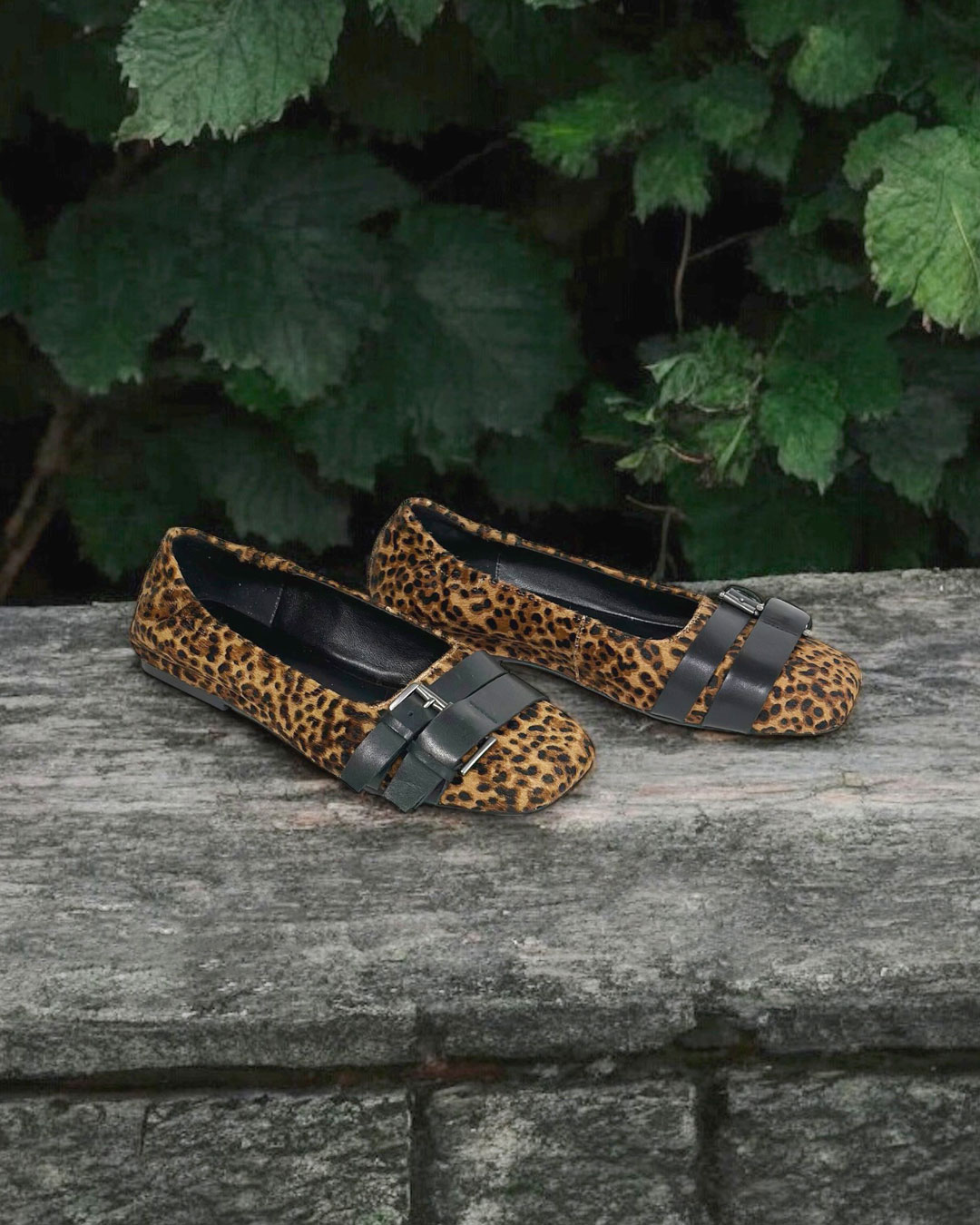 シンプルなフォルムのフラットパンプスをハラコ風のレオパード柄アッパーに仕上げ、主役級アイテムへとアップデートした一足。