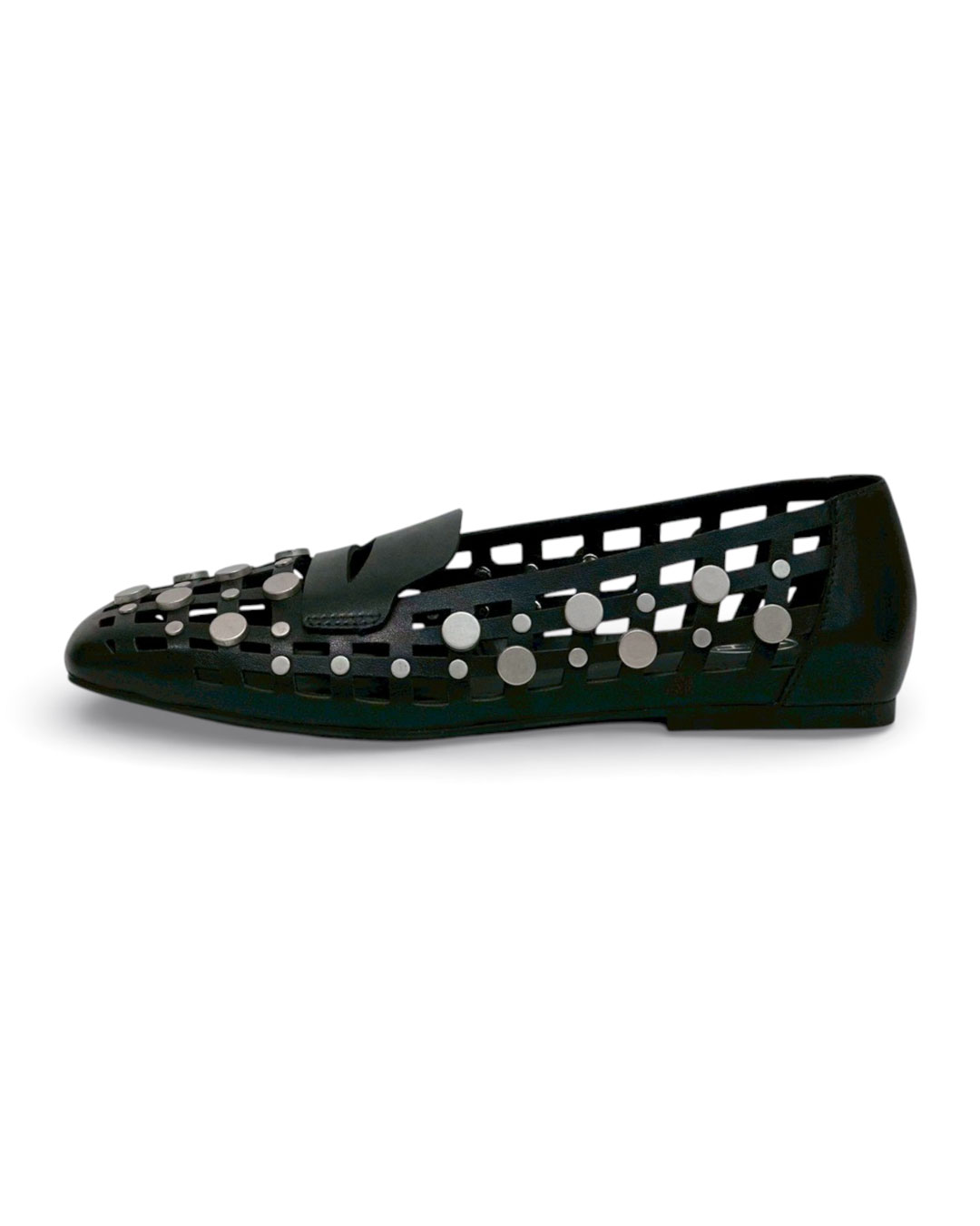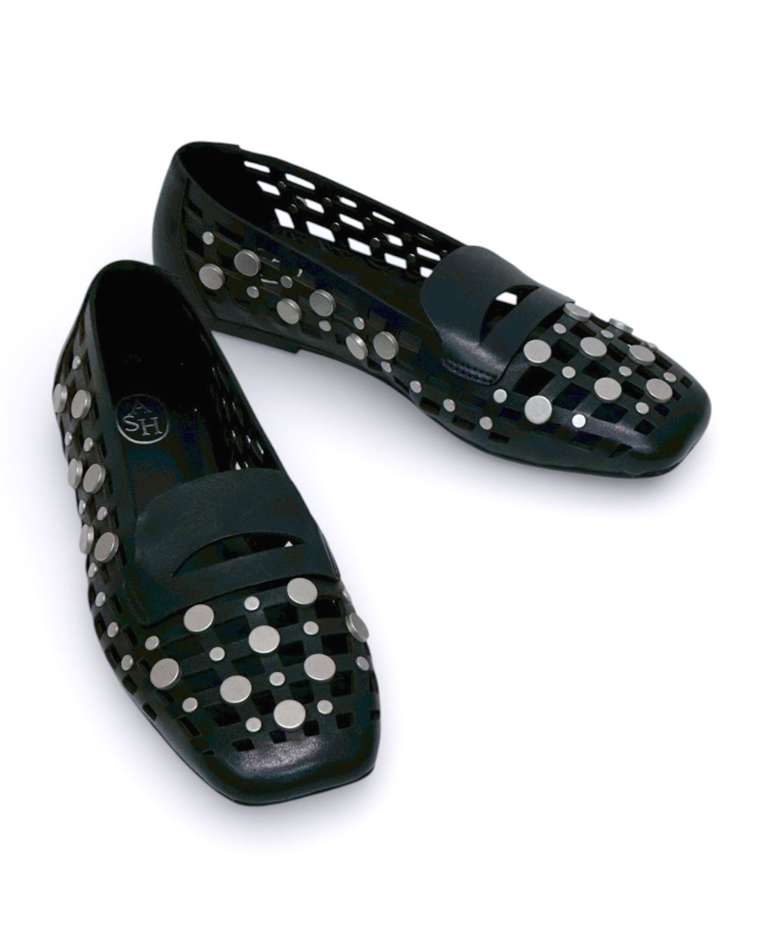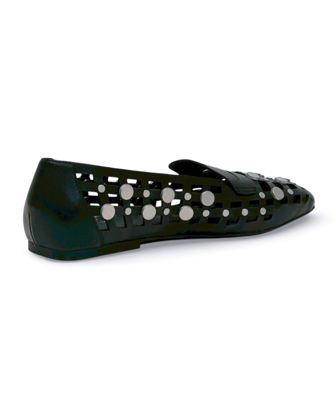 クールな印象のスクエアトゥに、編み込み調のカッティング、さらにドットのスタッズを贅沢に施したデコラティブで個性的な一足。