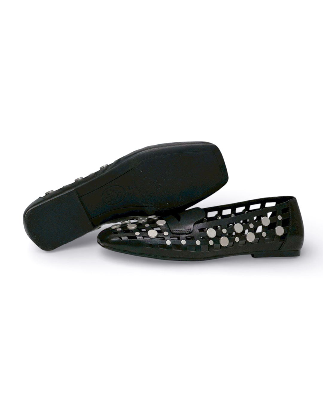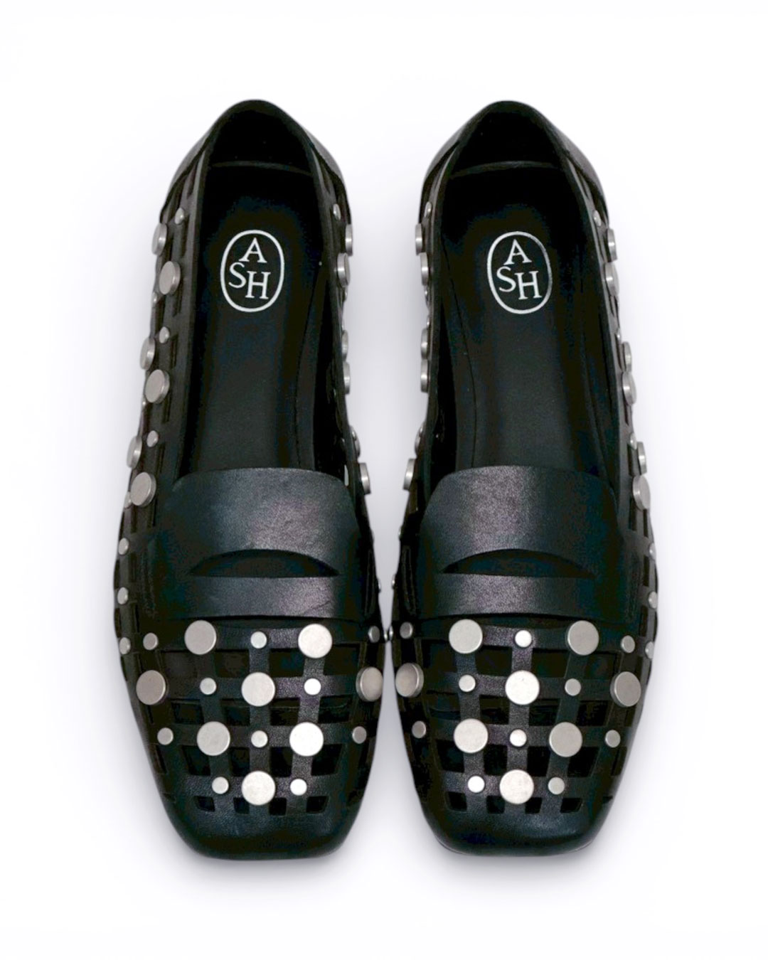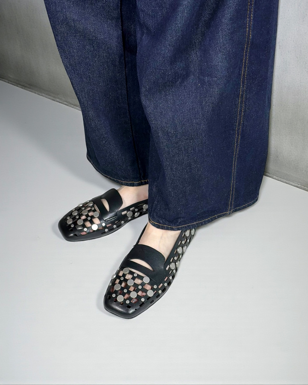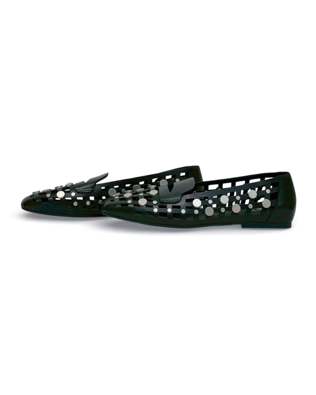 クールな印象のスクエアトゥに、編み込み調のカッティング、さらにドットのスタッズを贅沢に施したデコラティブで個性的な一足。