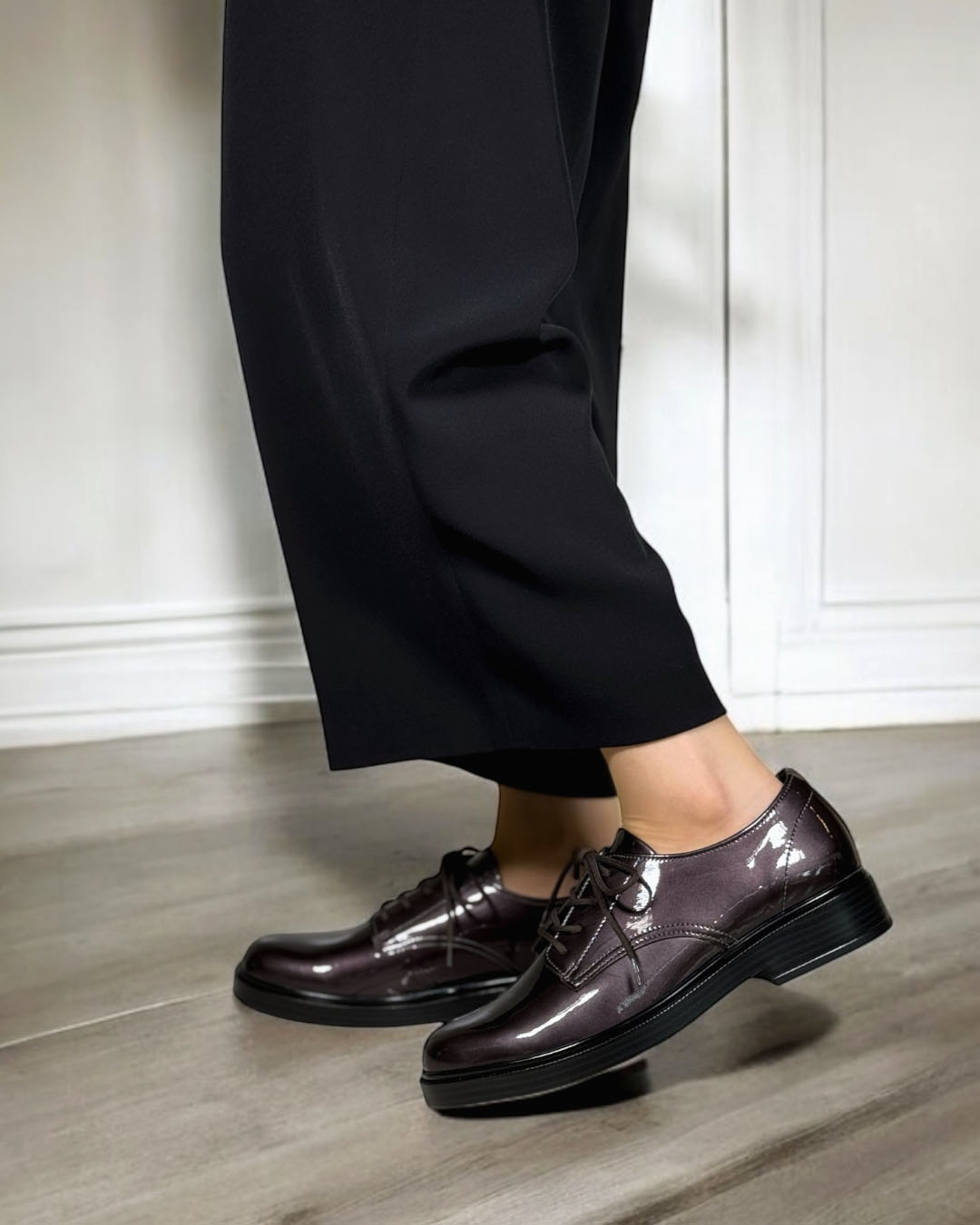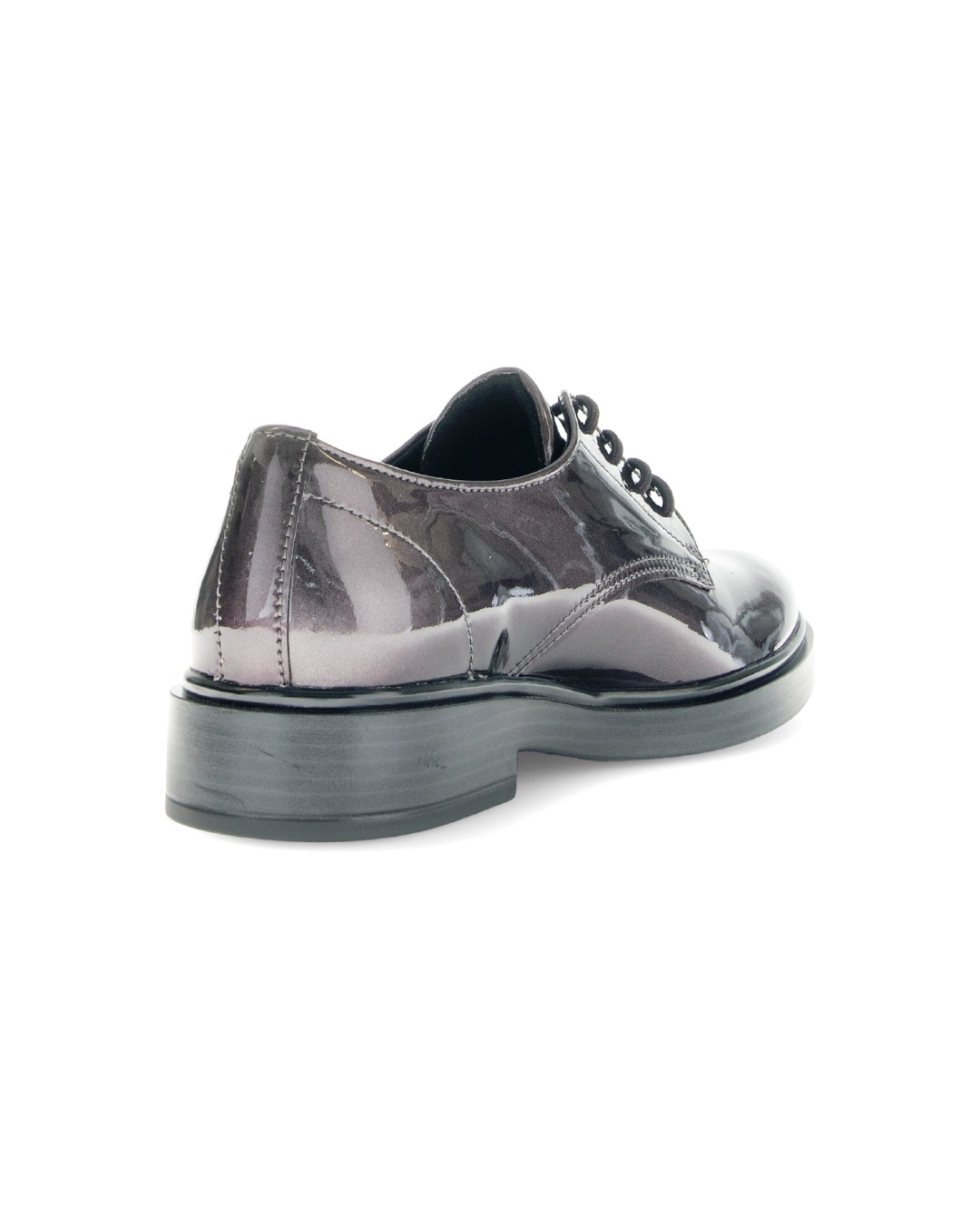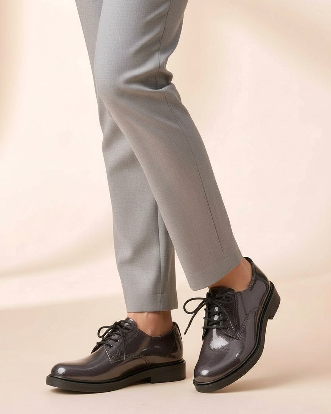 マニッシュな雰囲気が魅力のオックスフォードシューズですが、グレーカラーのエナメルレザーのため、優しい印象になっています。