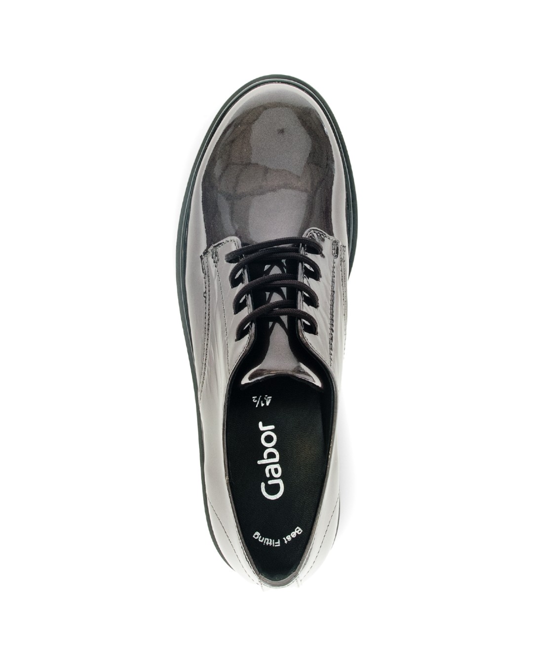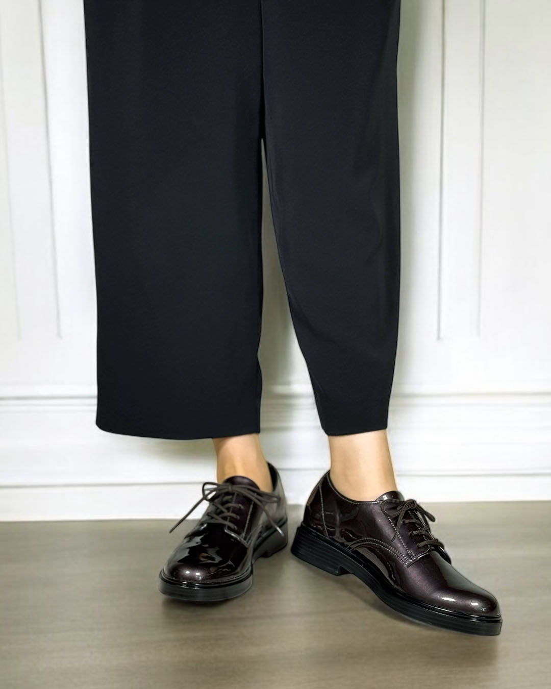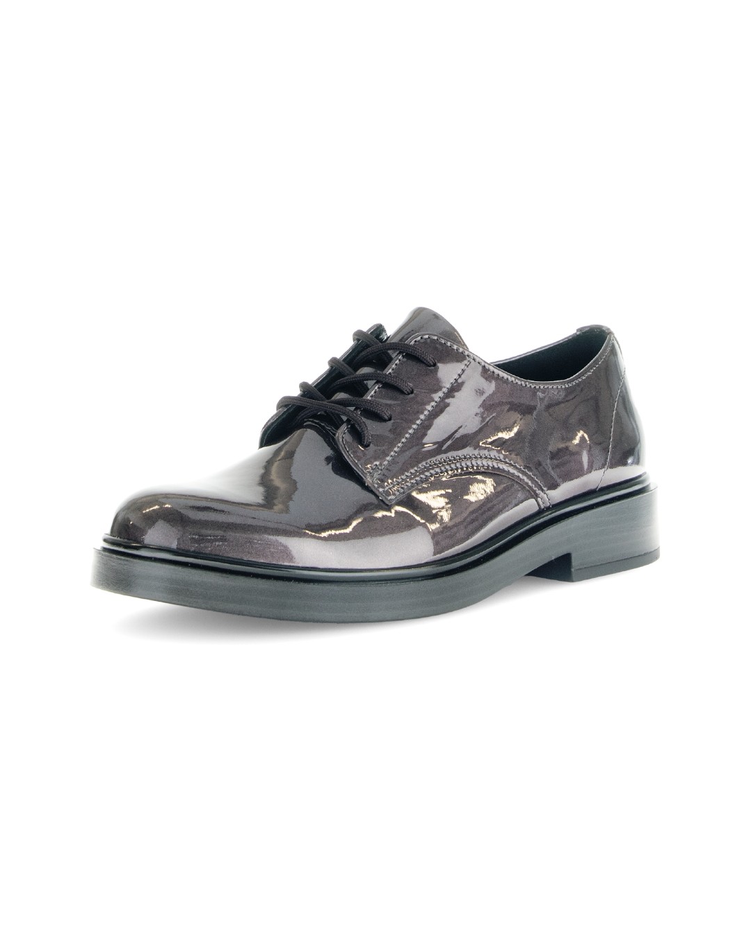 マニッシュな雰囲気が魅力のオックスフォードシューズですが、グレーカラーのエナメルレザーのため、優しい印象になっています。