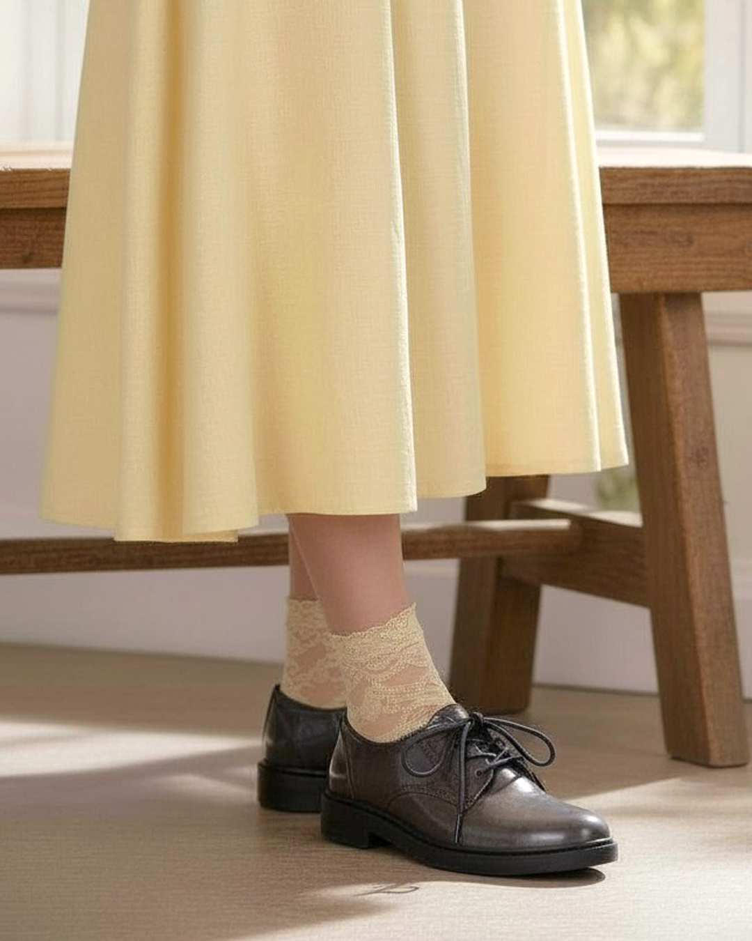 ワイドパンツやロングスカートに、レッドやくすみブルーなどのカラーソックスを合わせて、歩くたびにちらりと見えるのもおしゃれ。
