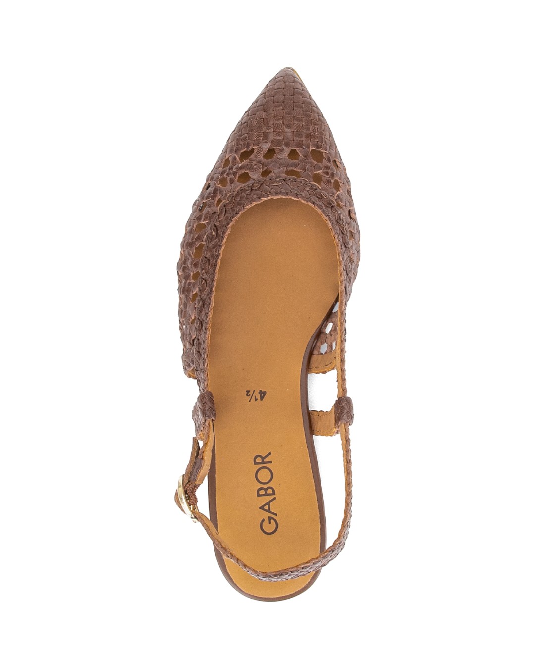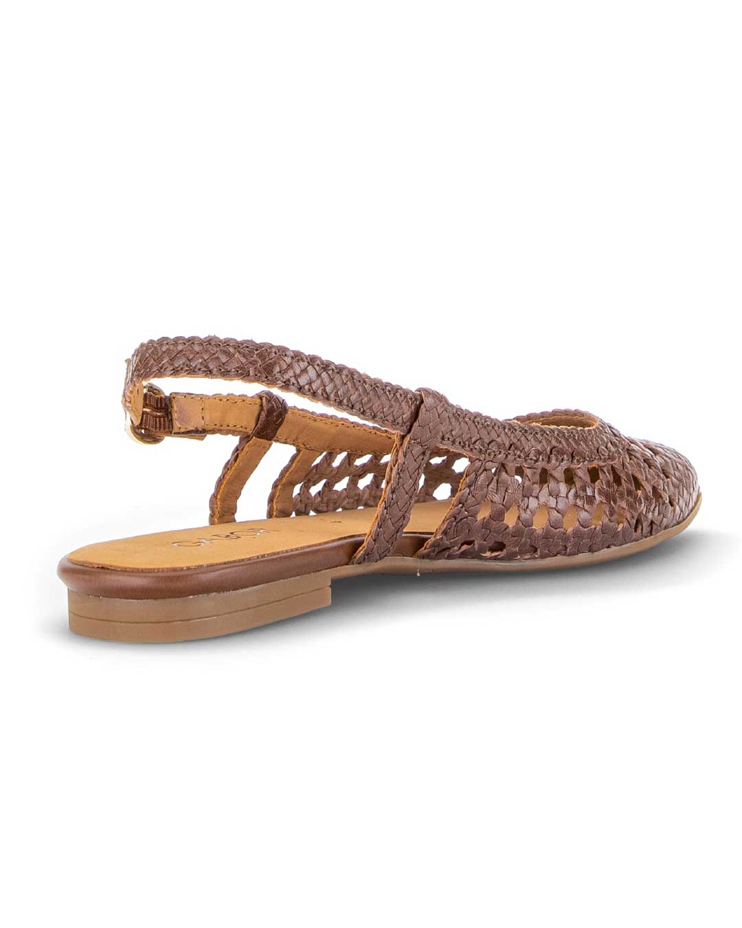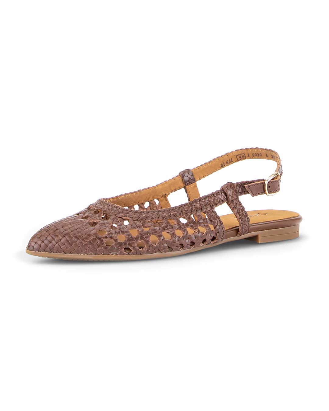 繊細な編み込みデザインが目を惹く、フラットタイプのバックストラップシューズ。