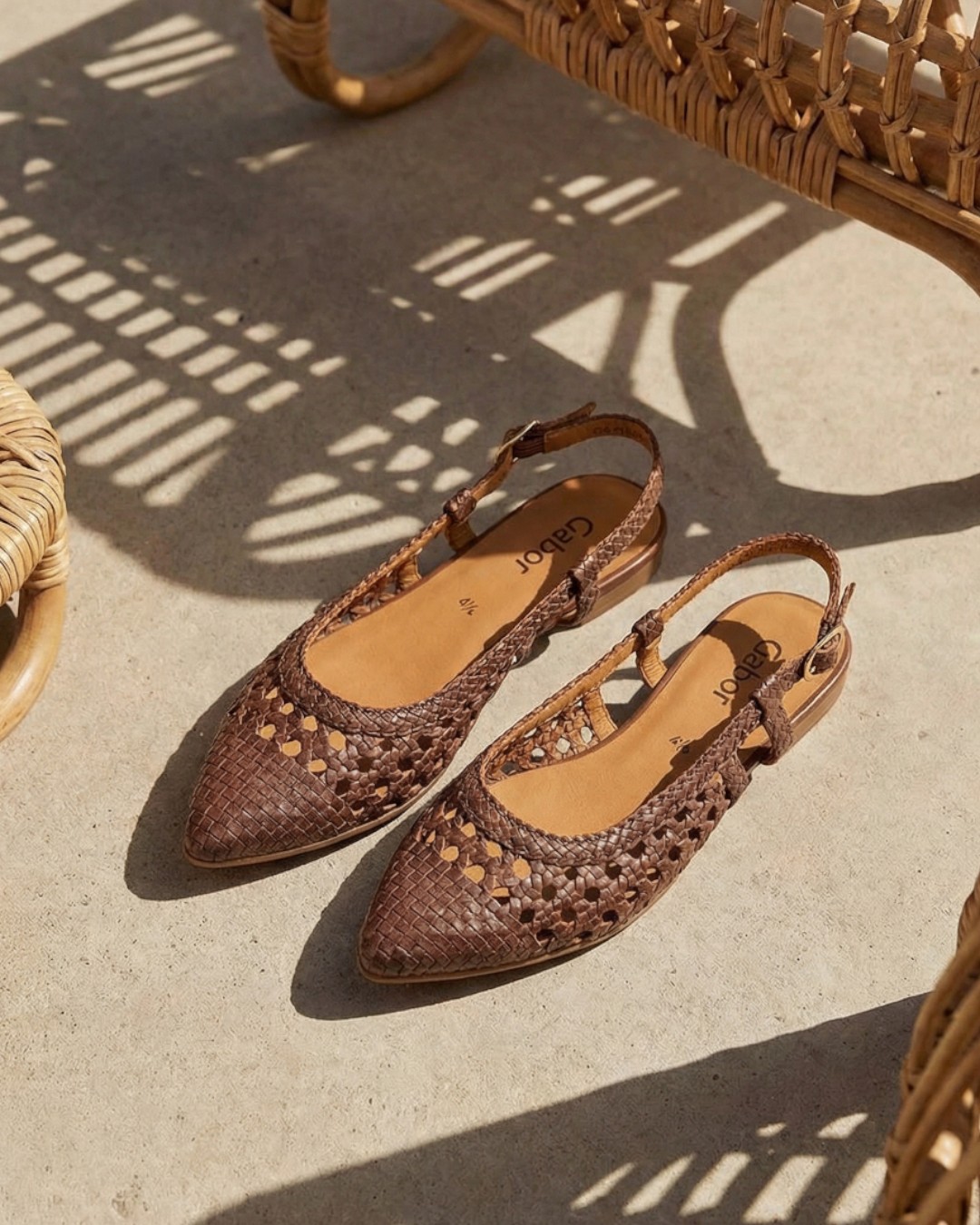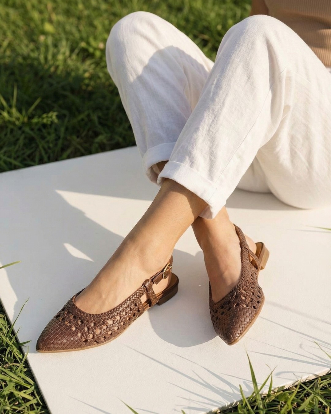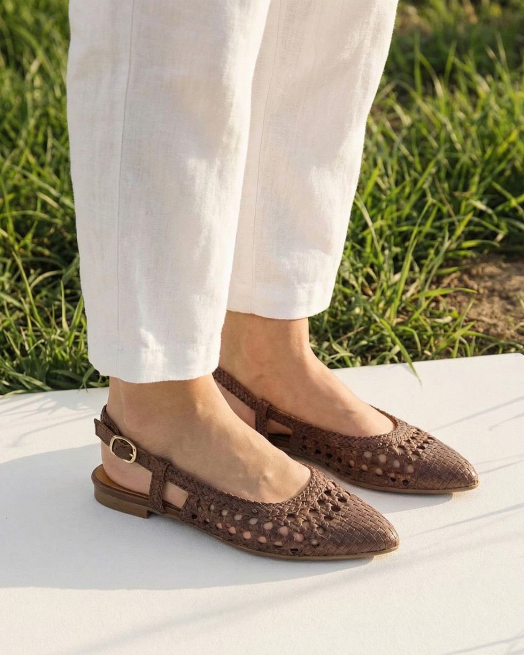 春夏の装いに自然と溶け込む、大人のための編み込みフラットシューズです。