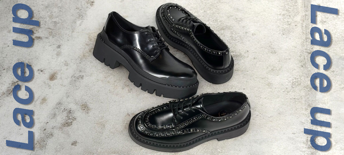 トラッドな印象のレースアップも、この秋はボリュームソールでモードにアップデート。