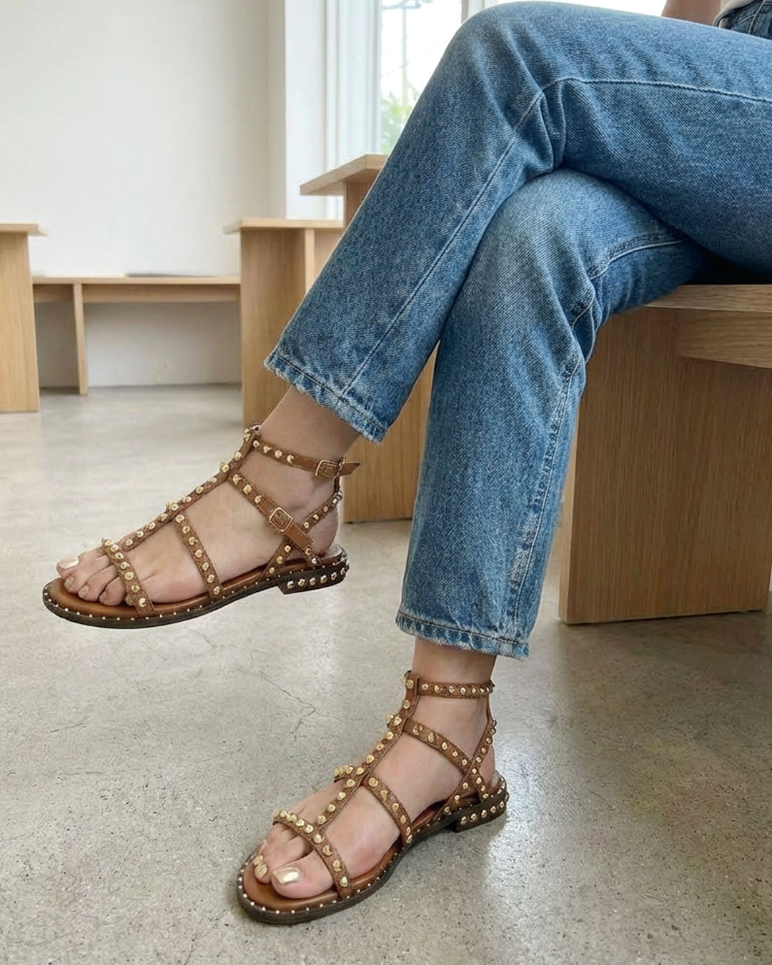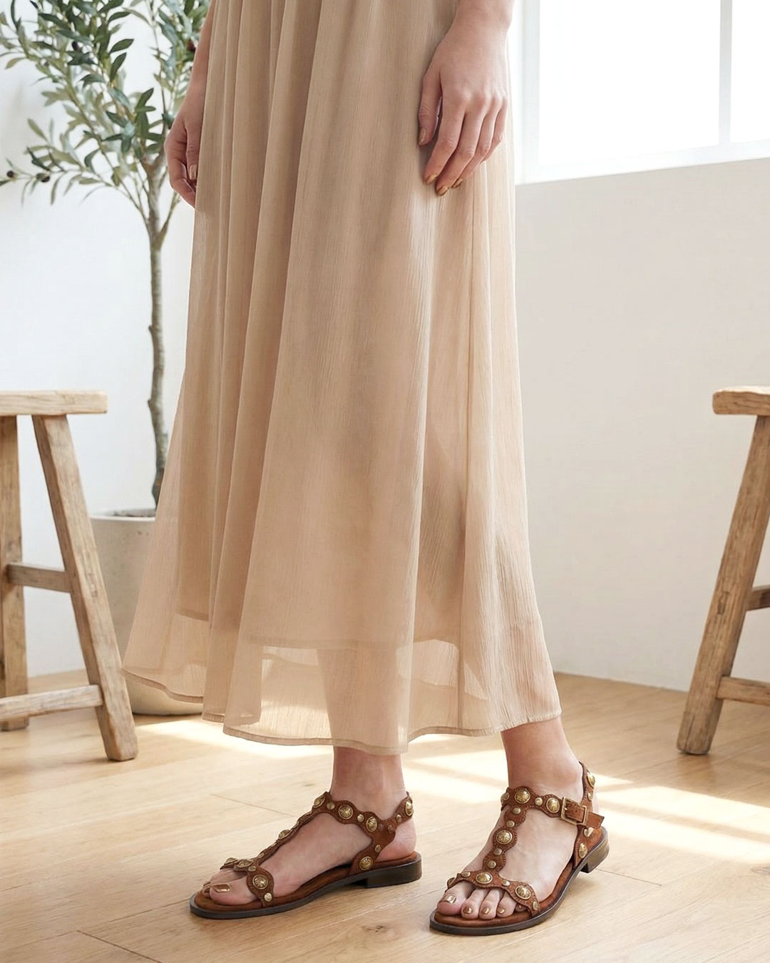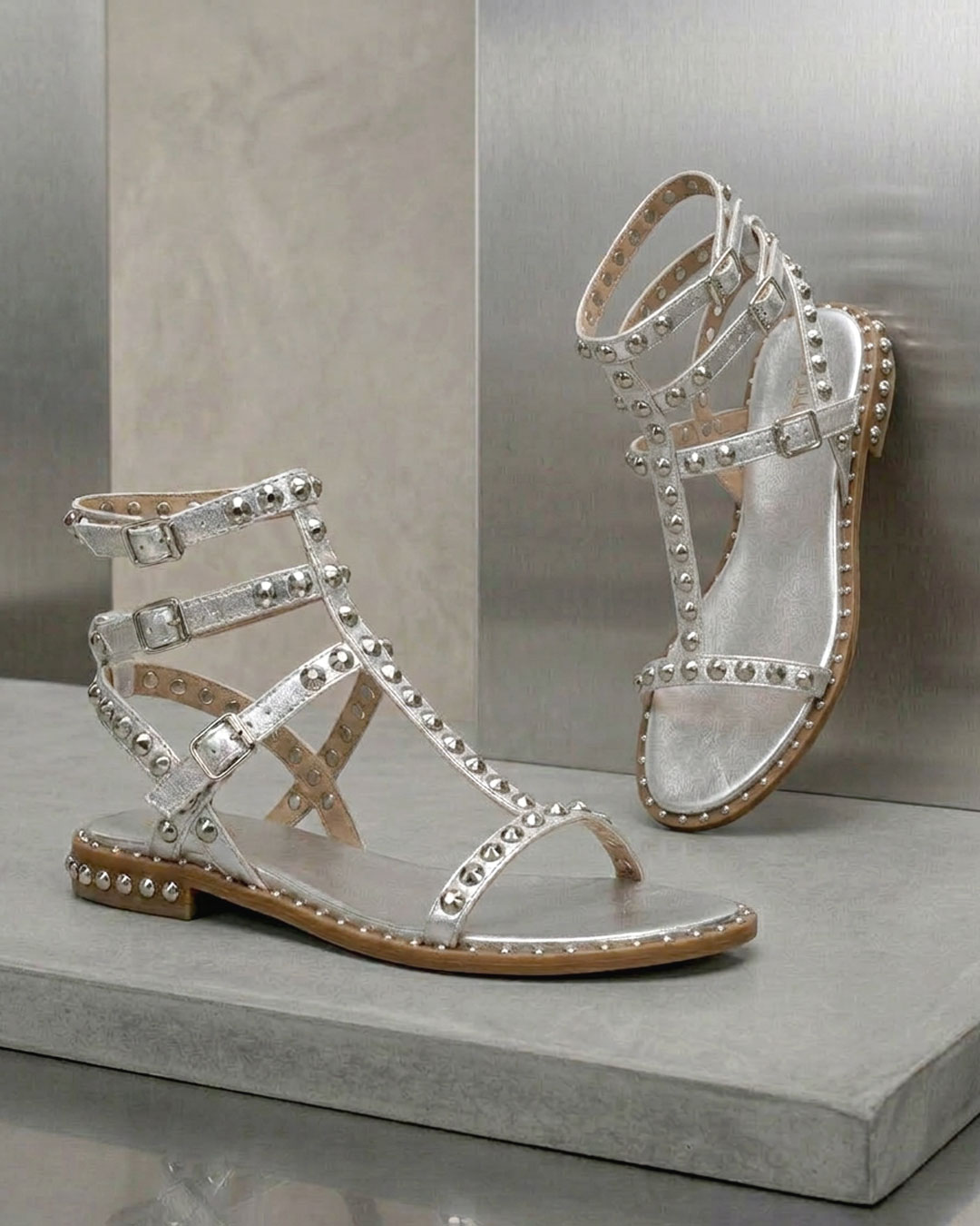 細身のストラップに贅沢にシルバースタッズを施し、エッジの効いたグラディエーターサンダル。