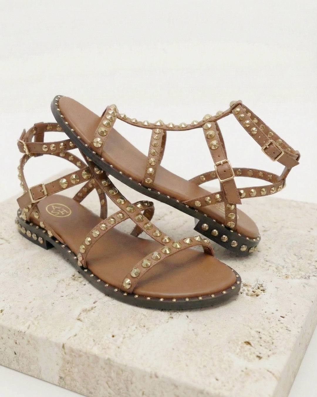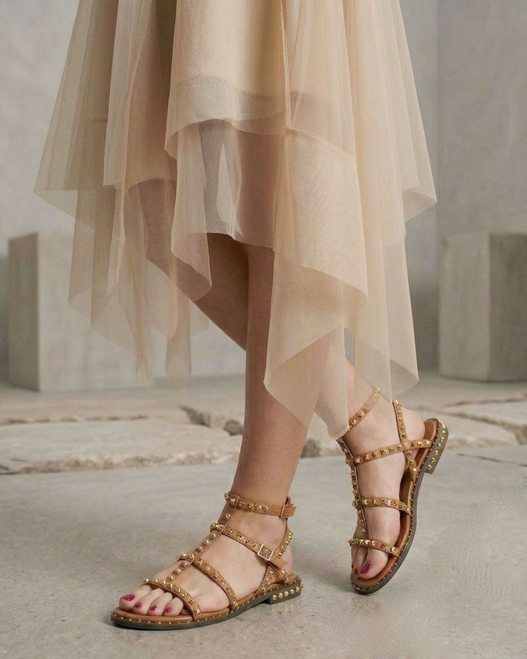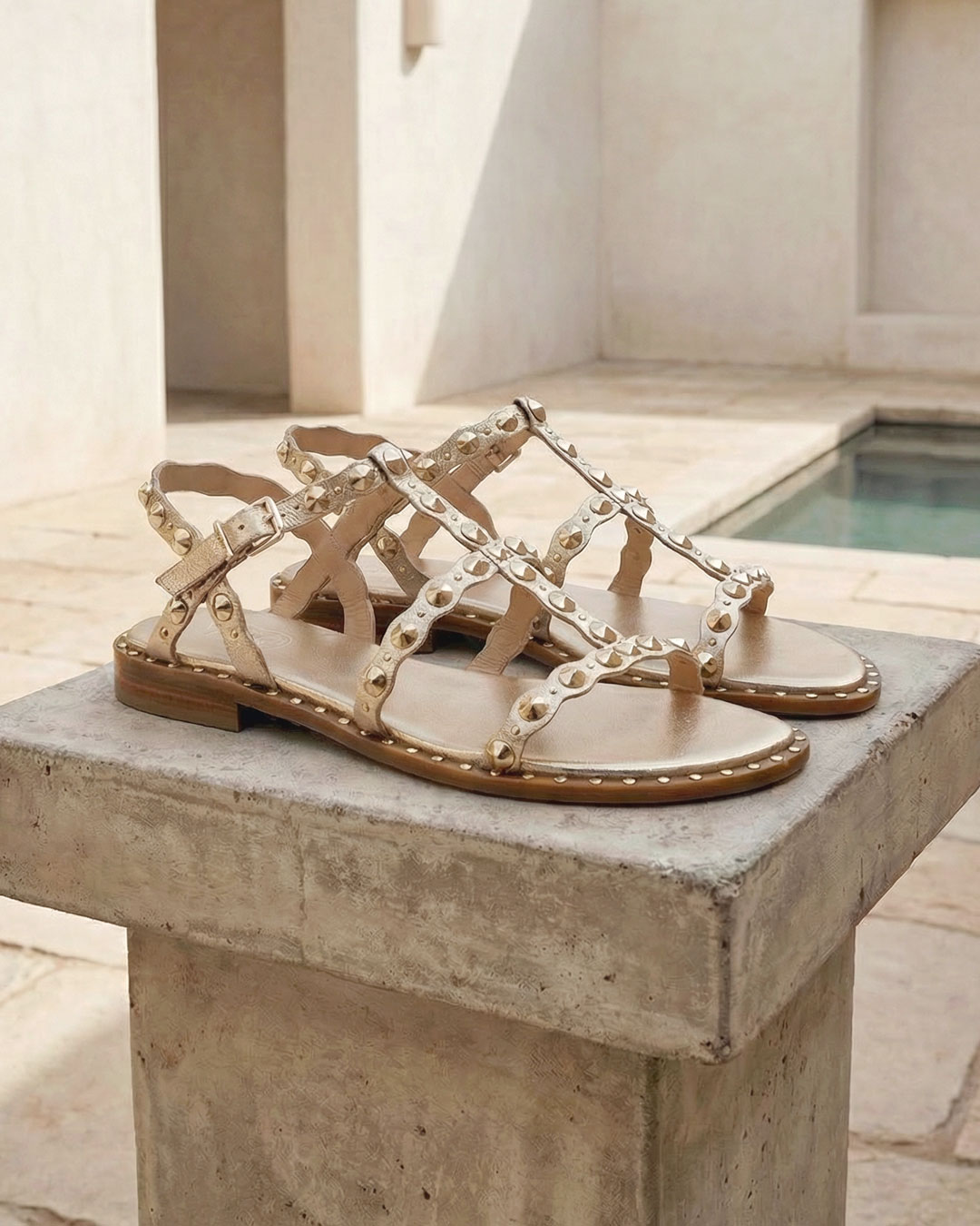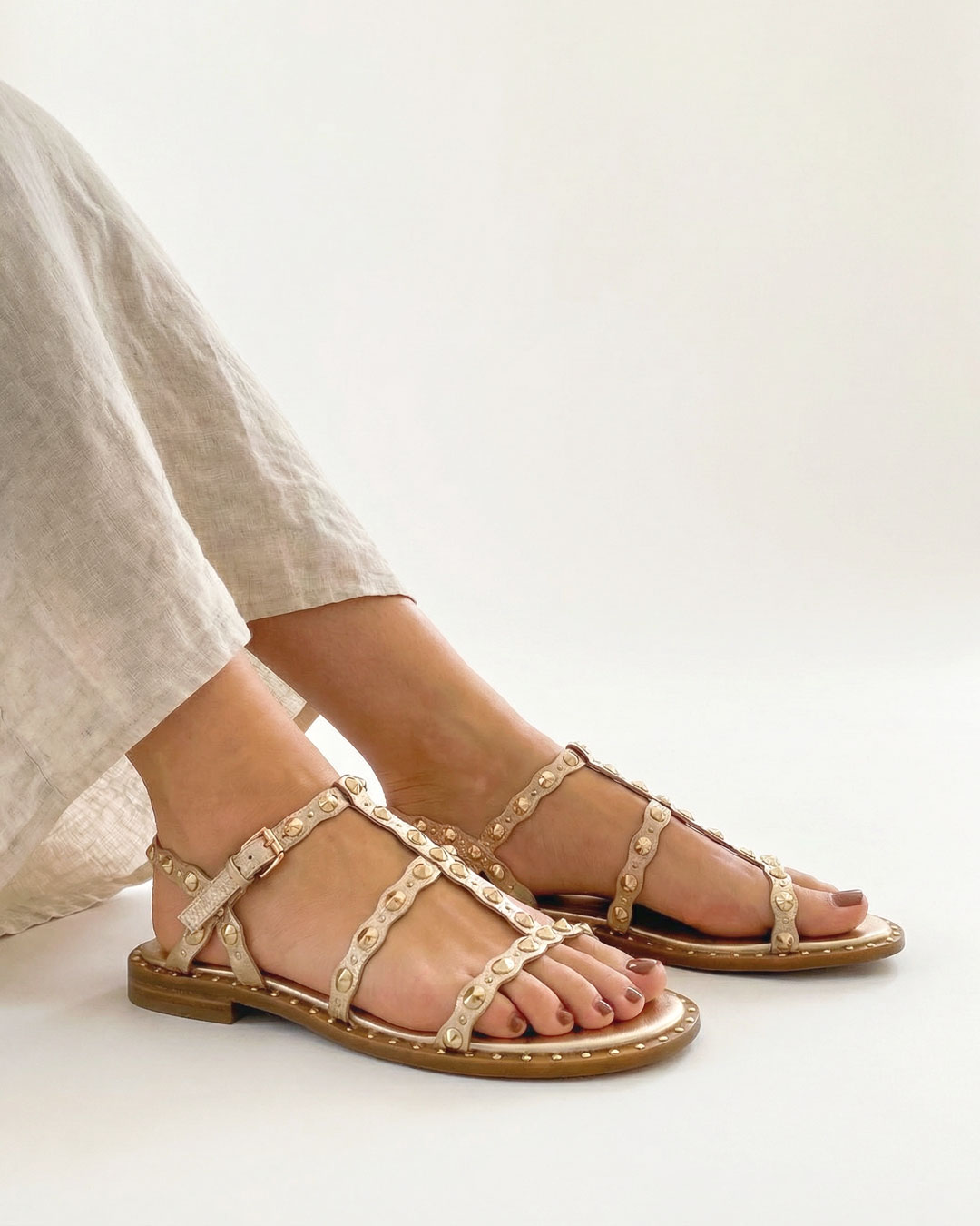 細見のストラップにデコラティブに施したゴールドスタッズが華やかなグラディエーターサンダル。