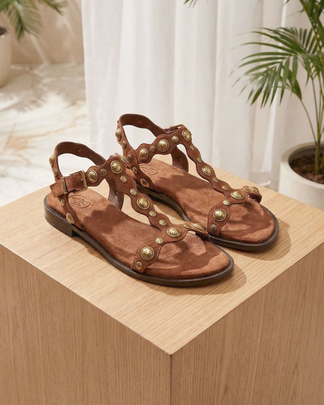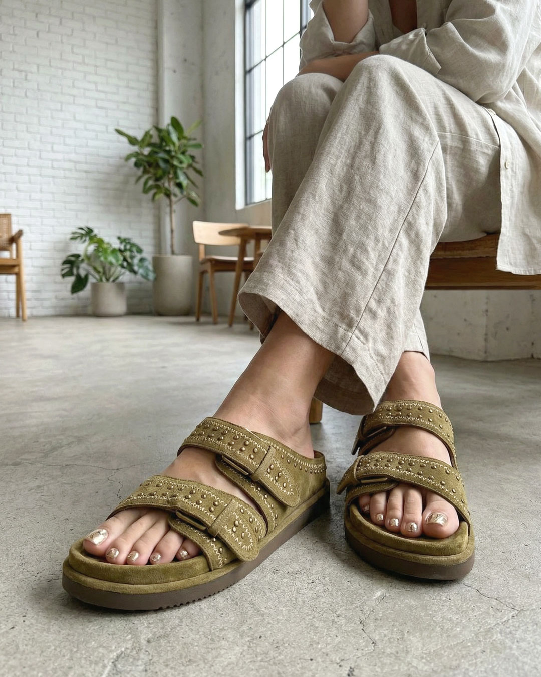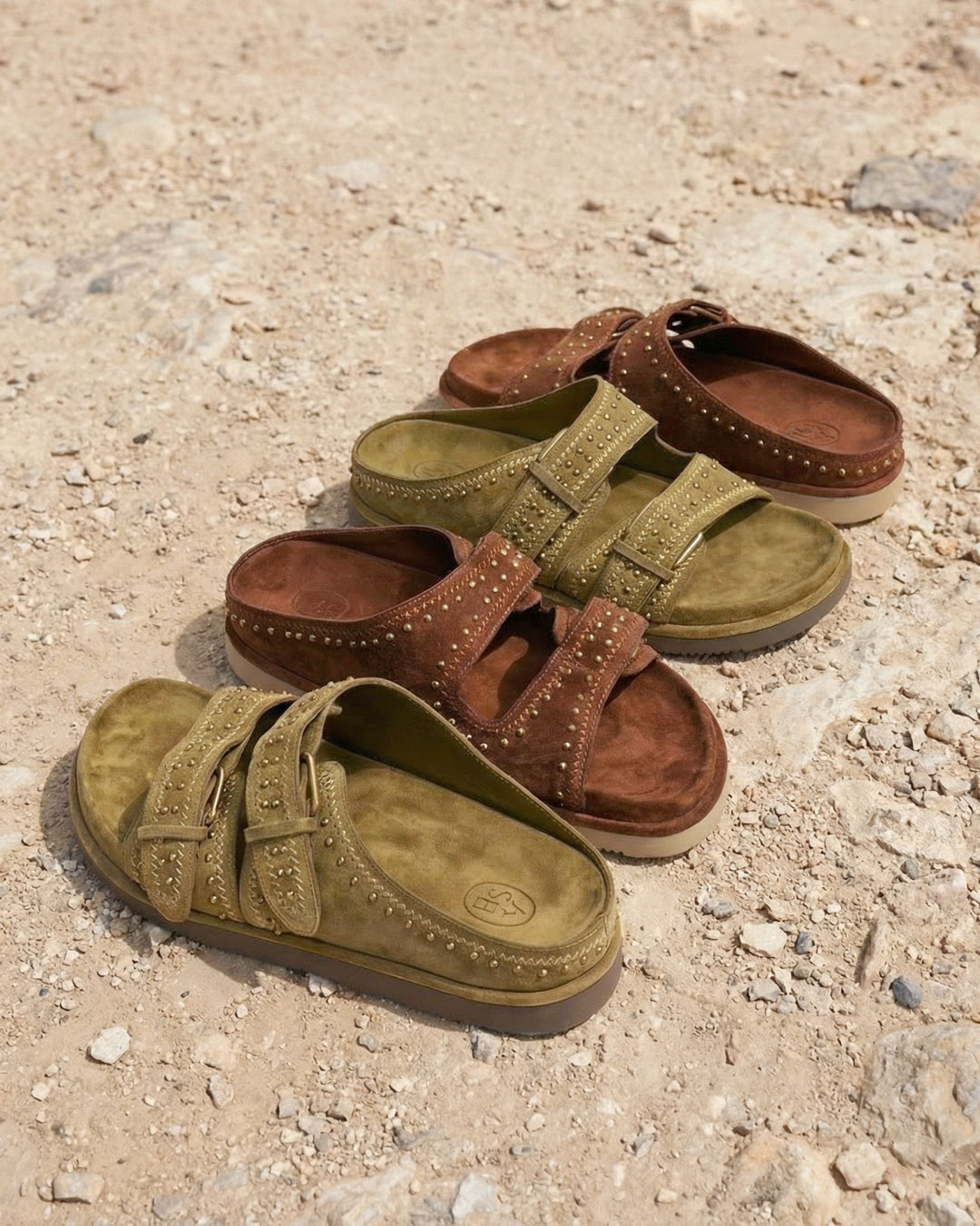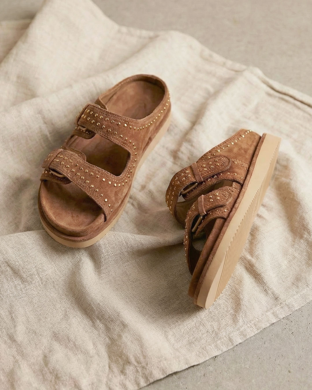 深みのあるブラウンカラーがモードなスタッズデザインのスエードフラットサンダル。