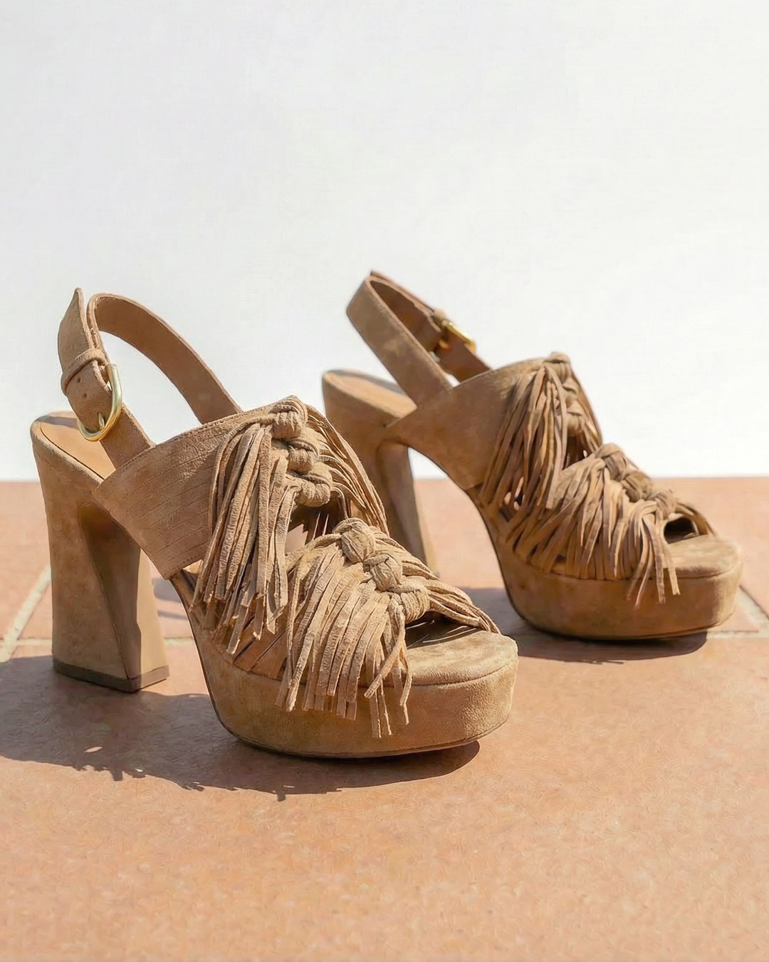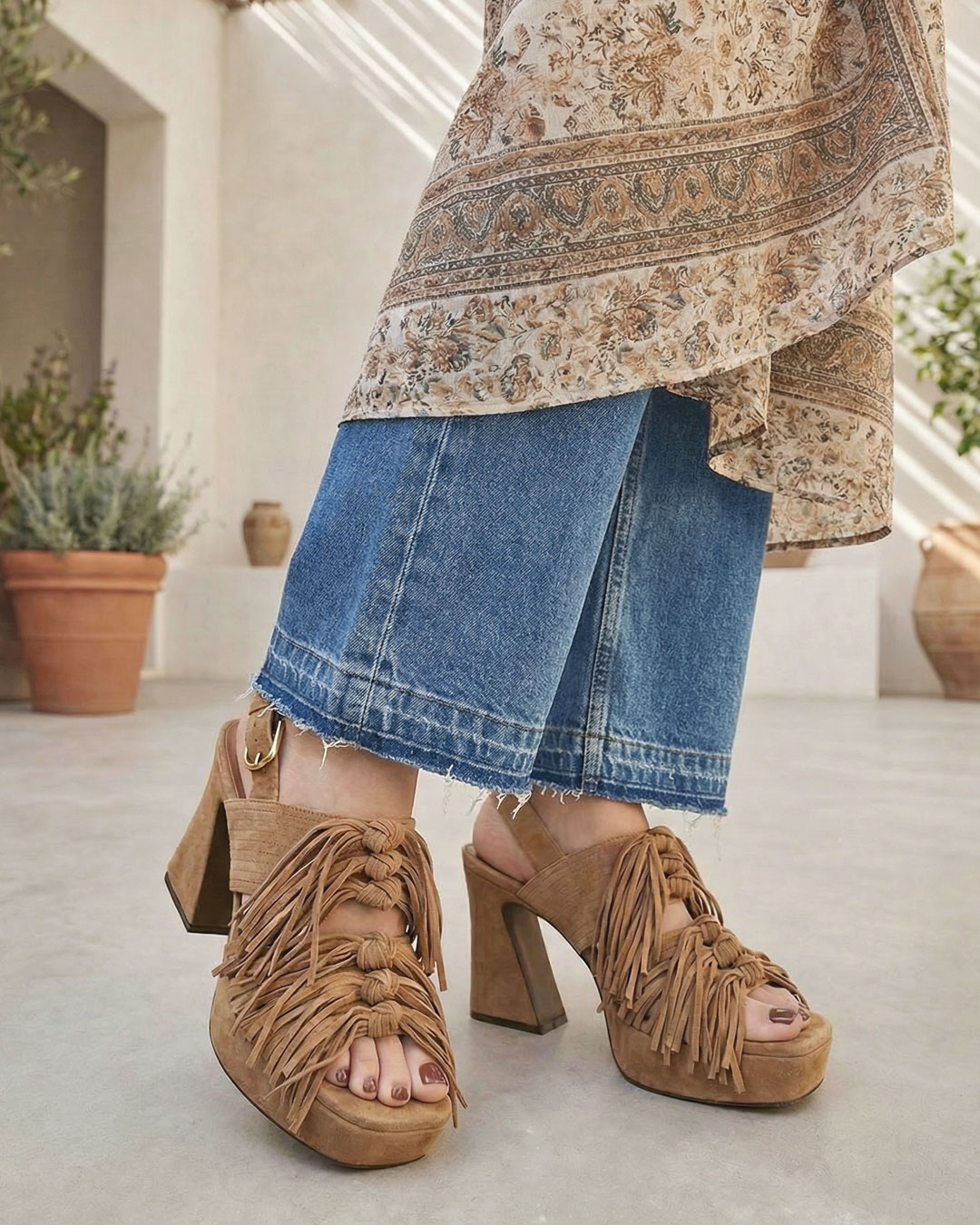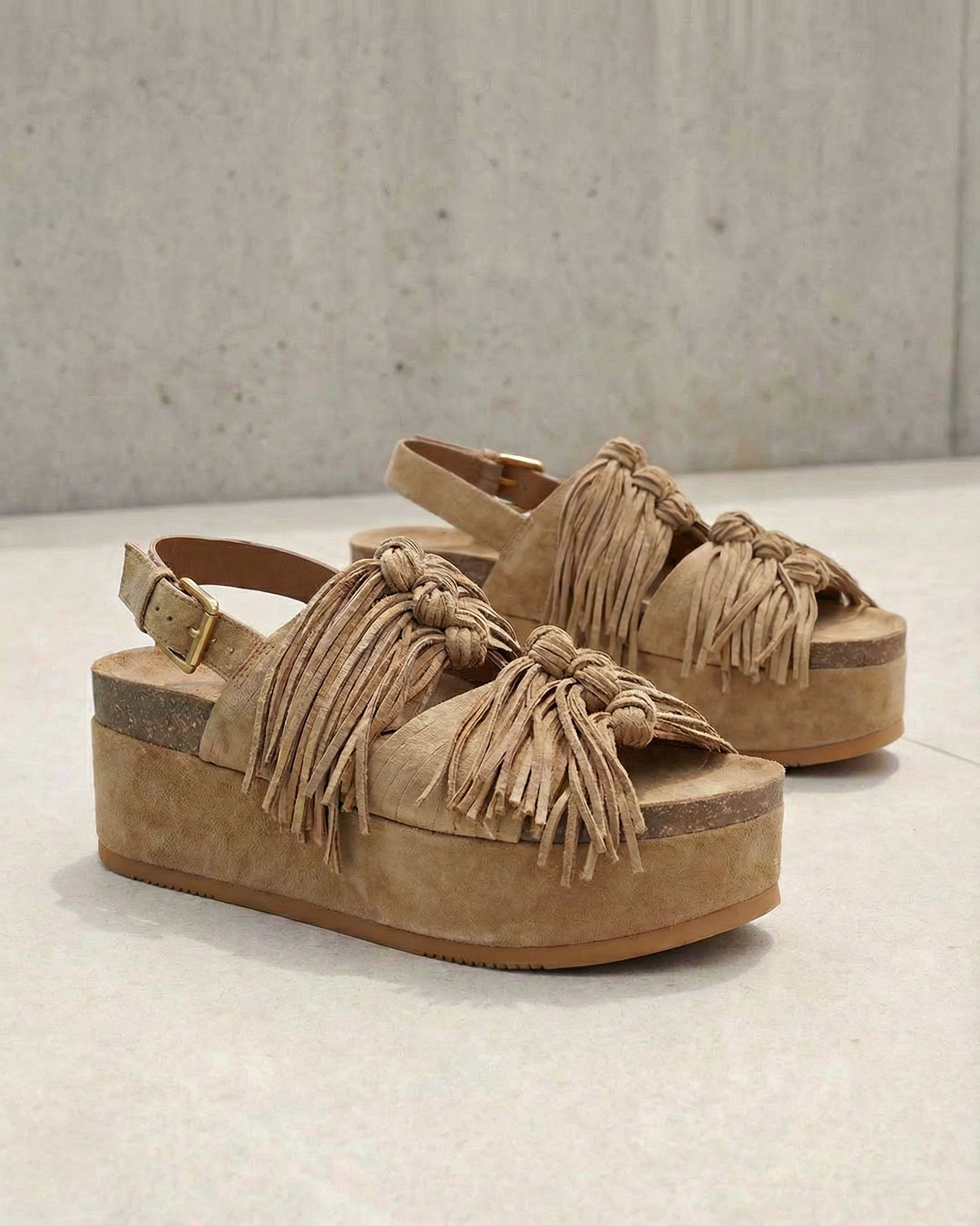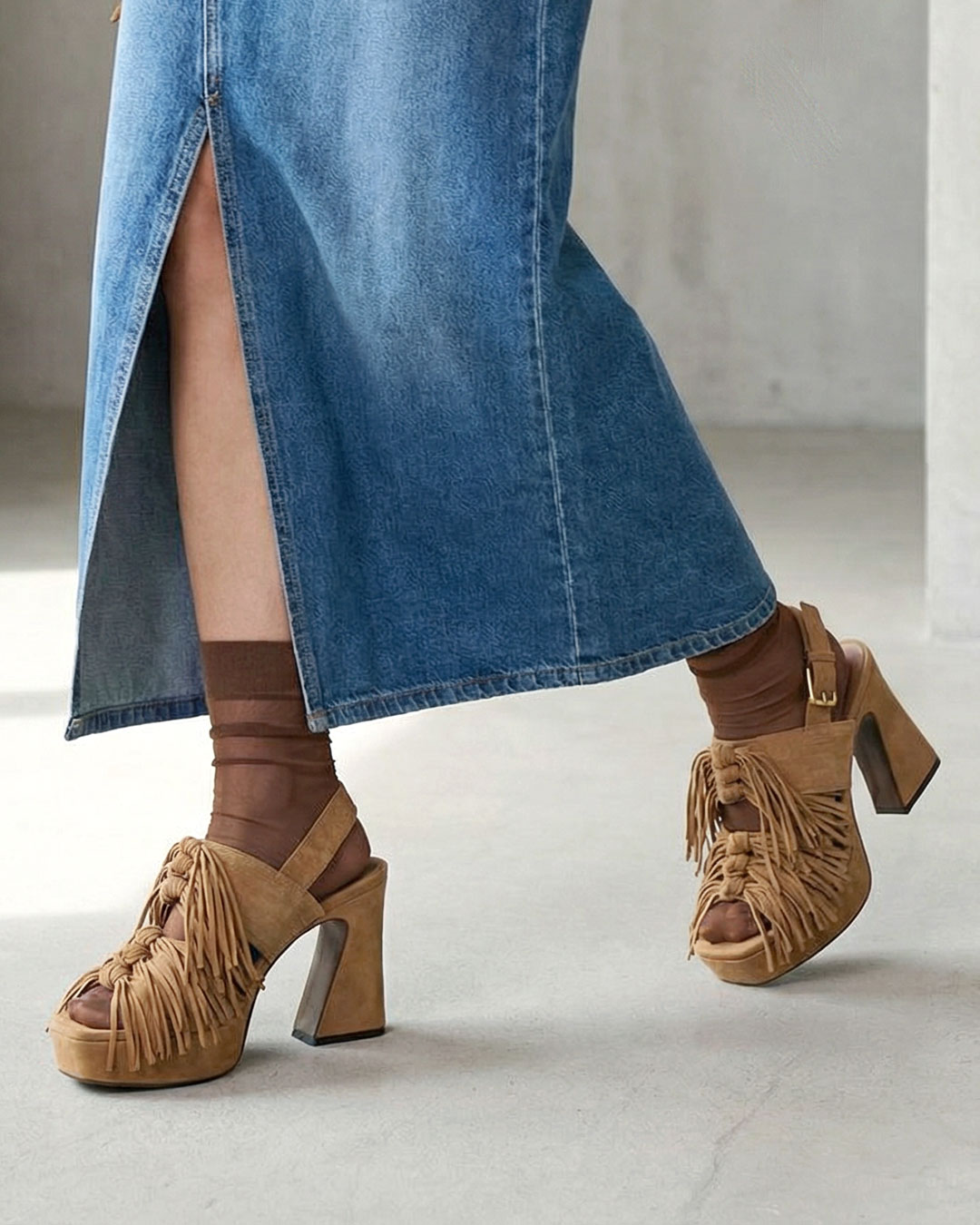 厚底やチャンキーヒール、フリンジデザインなど目を惹くアイテムもニュアンスカラーで自然な存在感に。