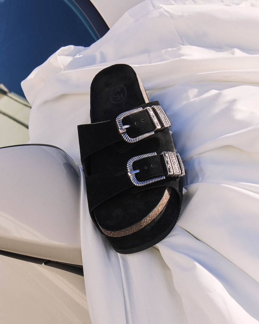 マットなブラックスエードに、アンティーク調のメタリックバックル、シルバースタッズを施したクールなデザイン。