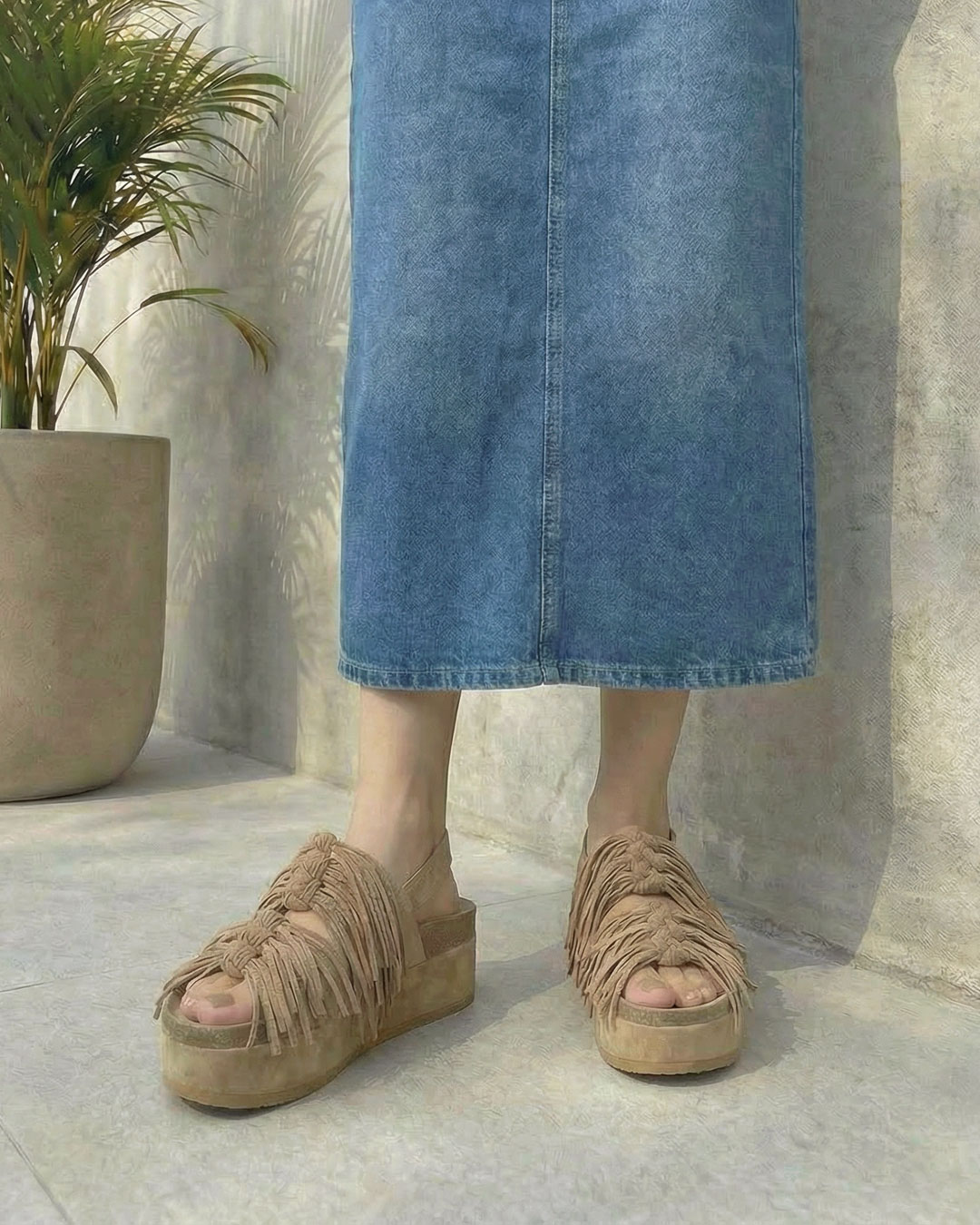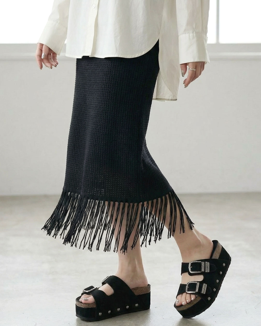 歩くたびにボリュームたっぷりのフリンジが揺れ、存在感たっぷり。