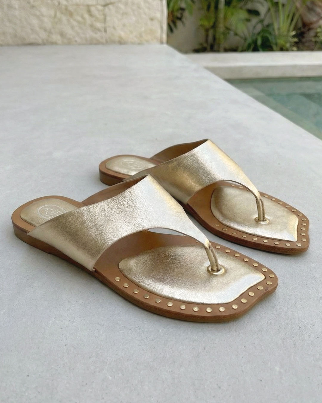 やわらかく輝くゴールドカラーのスタッズフラットサンダル。