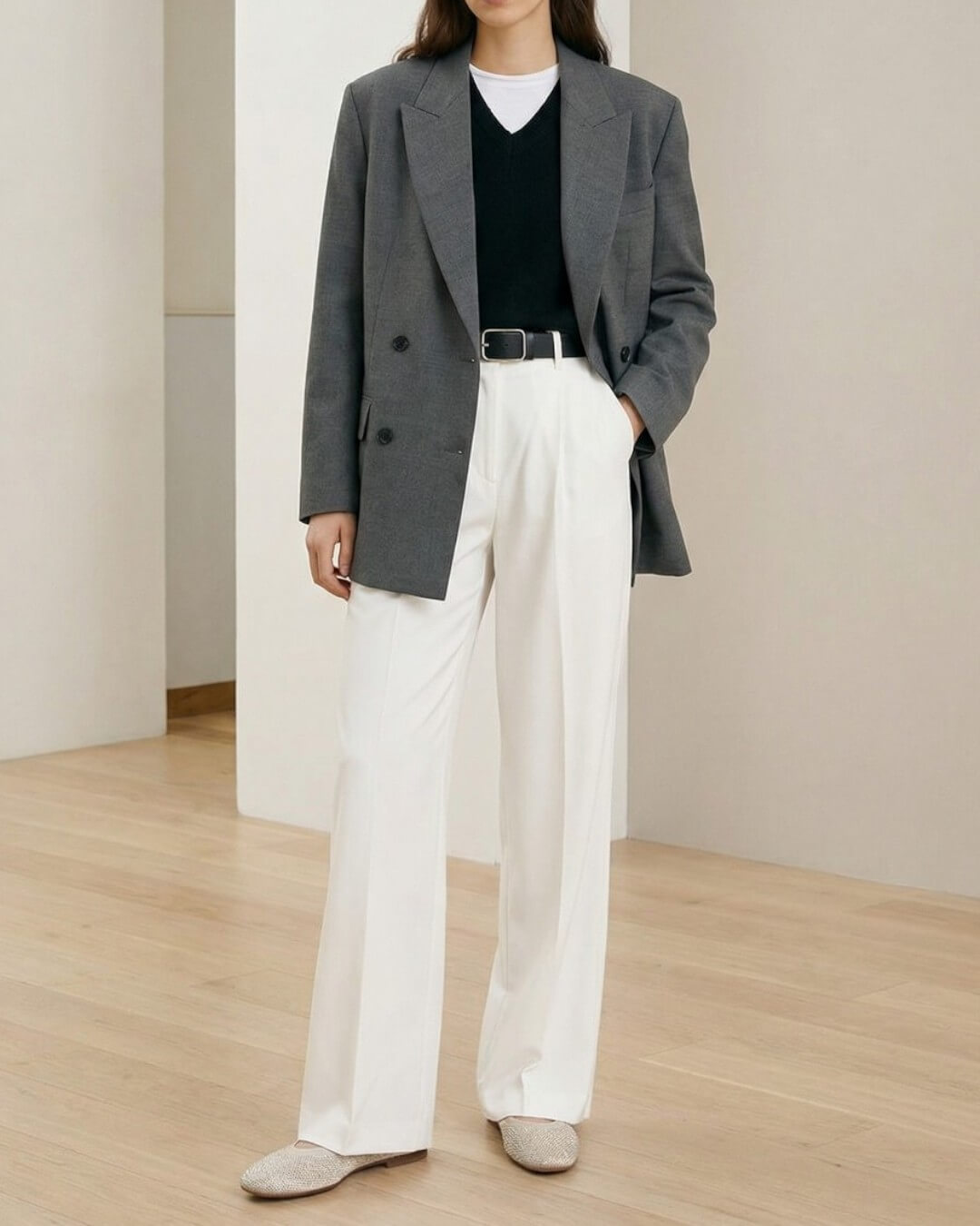きちんと感のあるパンツスタイルに。 ラメのさりげない輝きが足元に上品なアクセントをプラス。