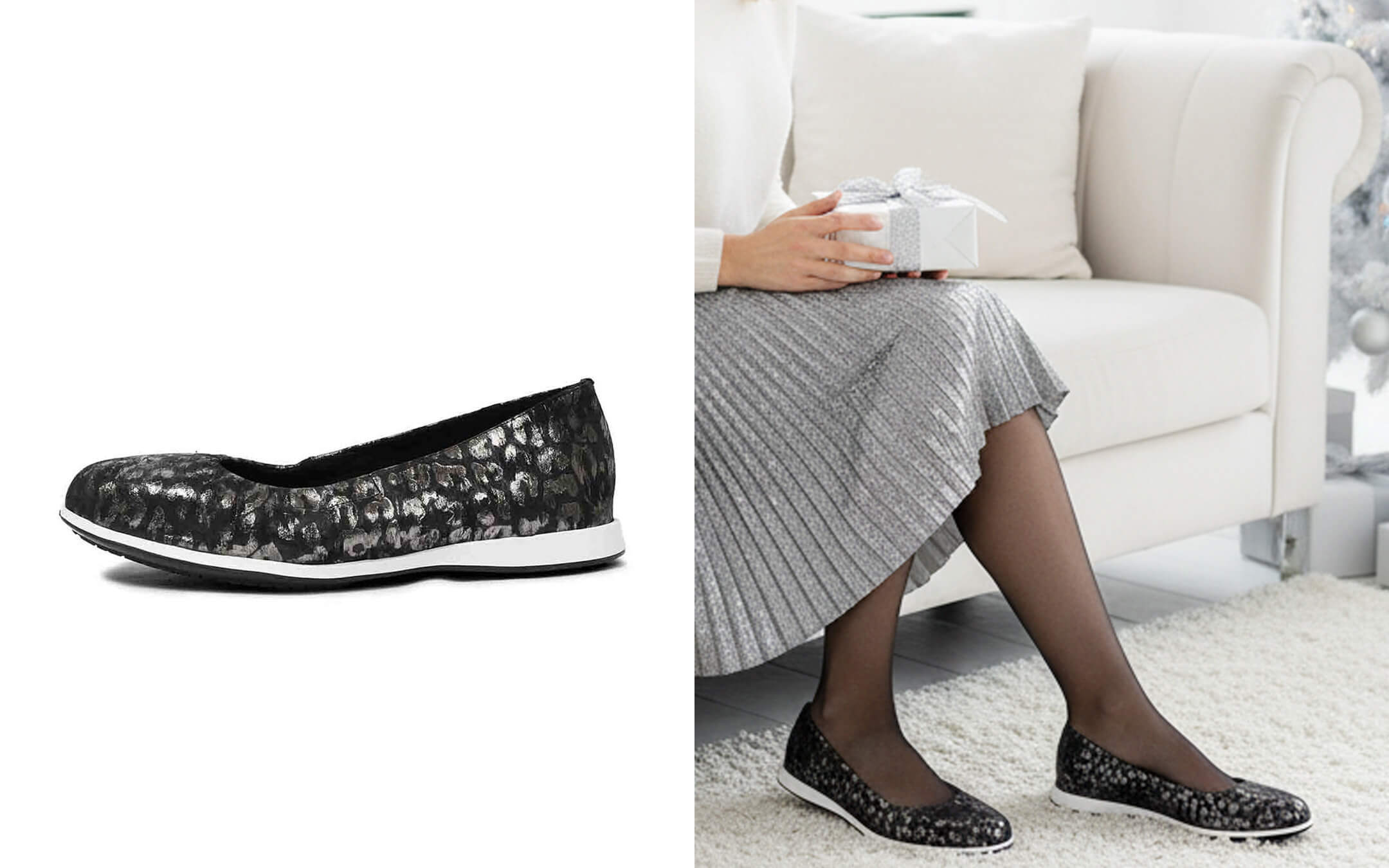 華やかなクリスマスシーズンにぴったりな、上品な輝きをまとったバレエシューズです。