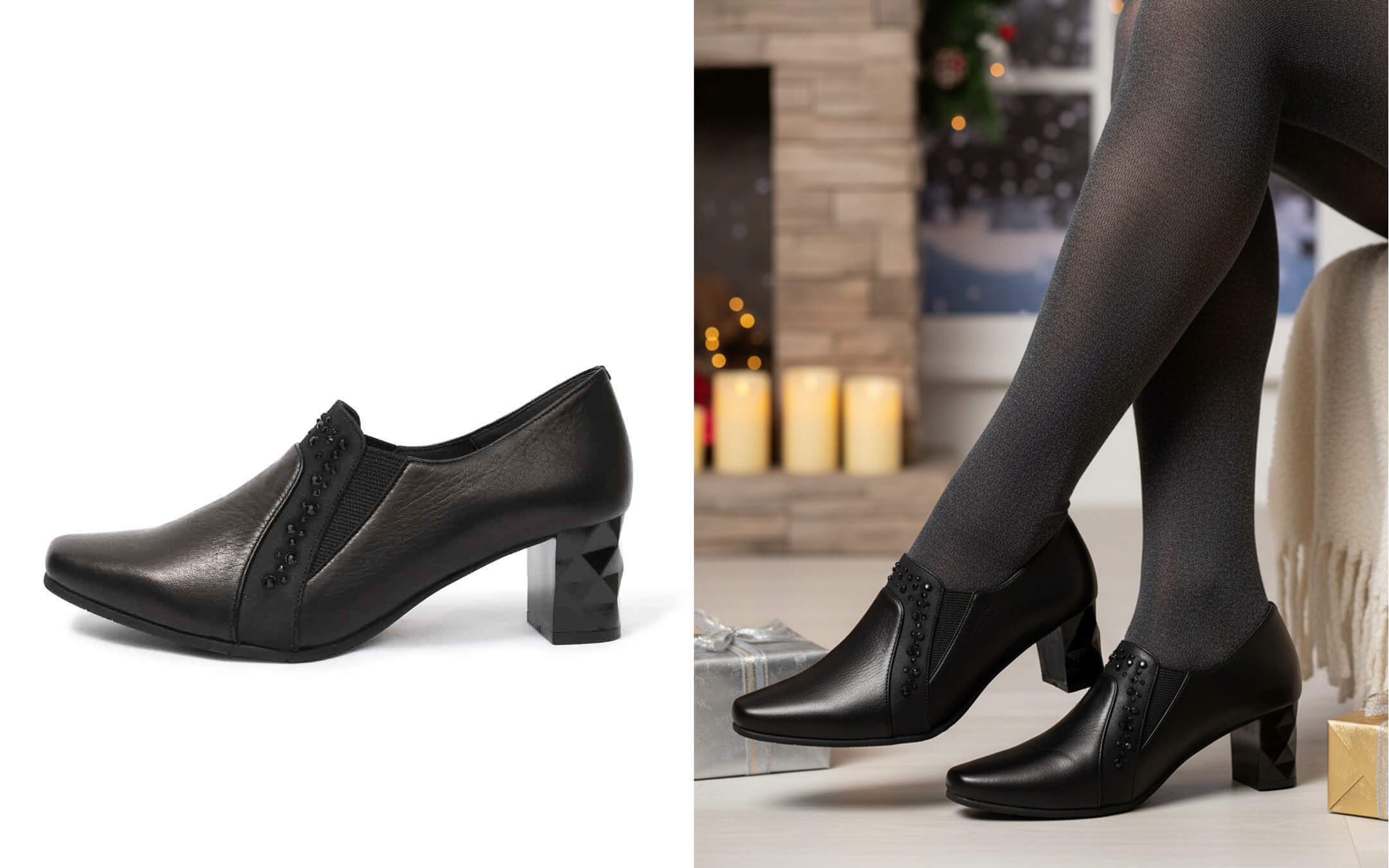 上品なツヤ感のあるブラックレザーに、フロントのビジュー調デザインがさりげなく華やぎを添える、大人のクリスマスコーデにぴったりの一足です。